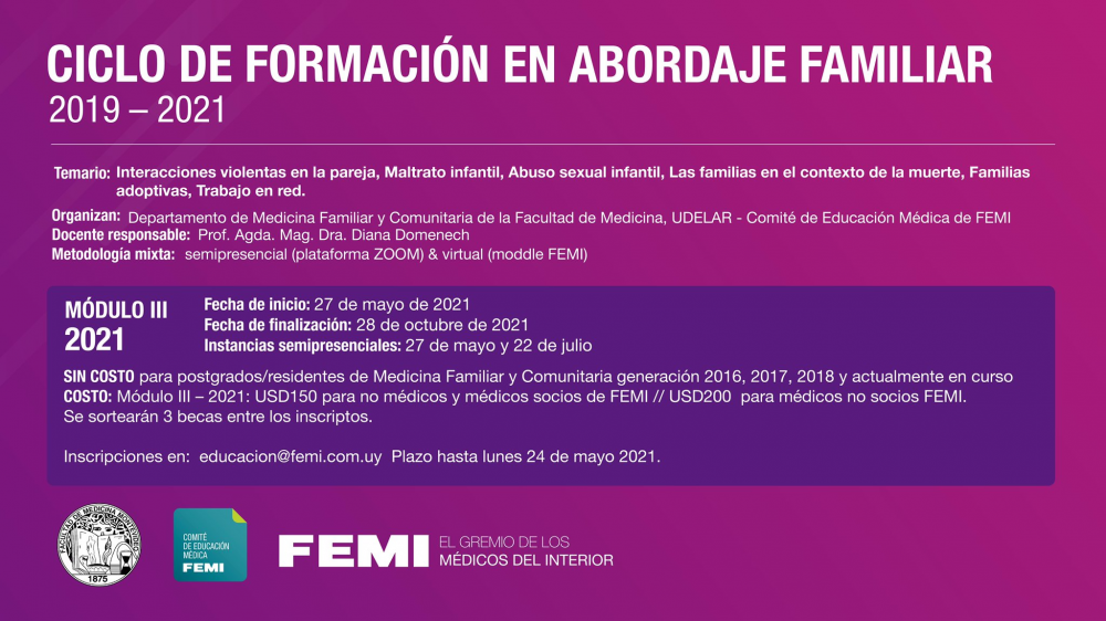 Ciclo de formación en Abordaje Familiar - Módulo III El próximo 27 de mayo dará inicio el tercer módulo del Ciclo de Formación en Abordaje Familiar, a [...]