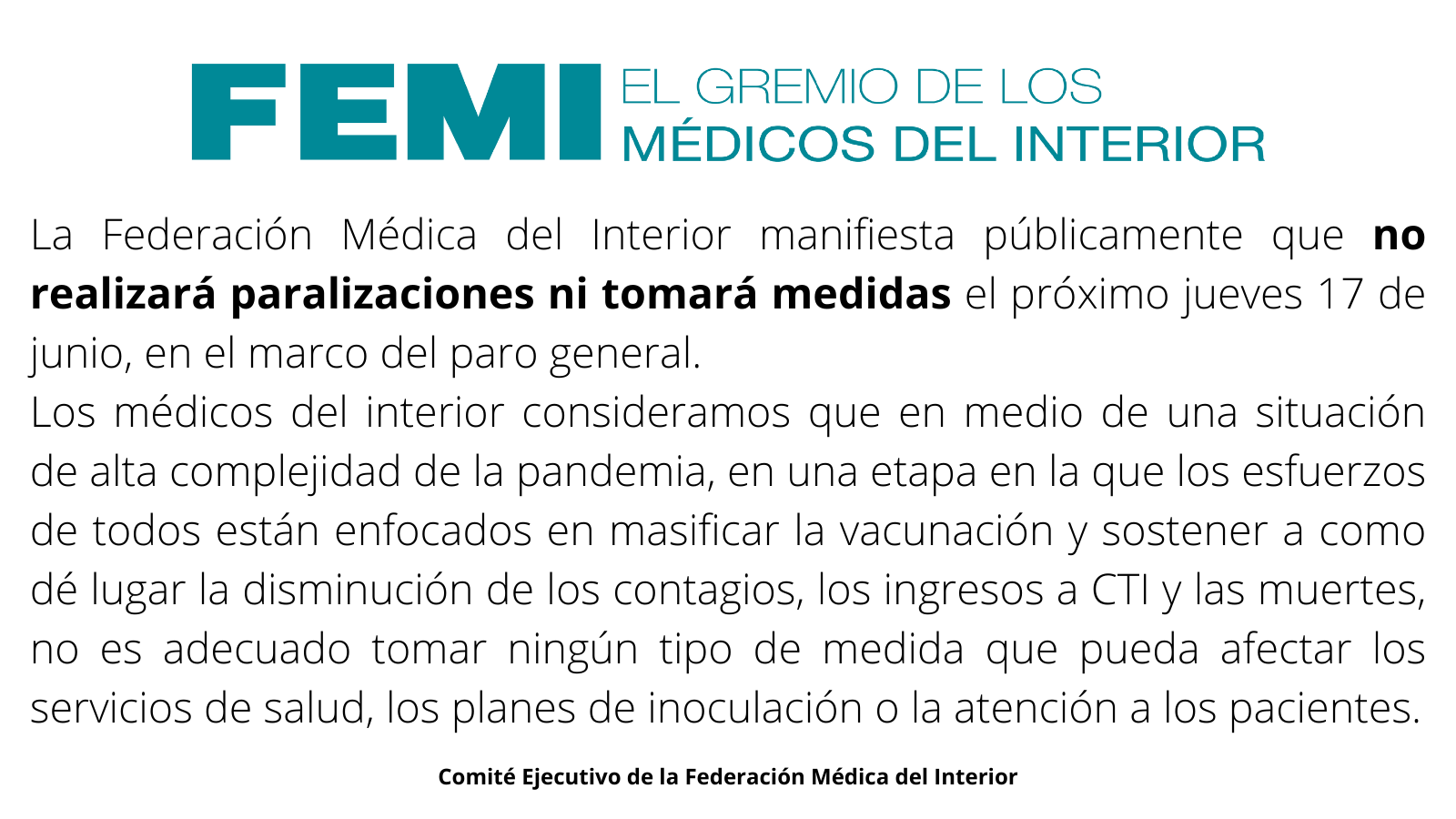 FEMI no realizará paralizaciones ni tomará medidas el 17 de junio La Federación Médica del Interior manifiesta públicamente queel próximo jueves 17 de [...]