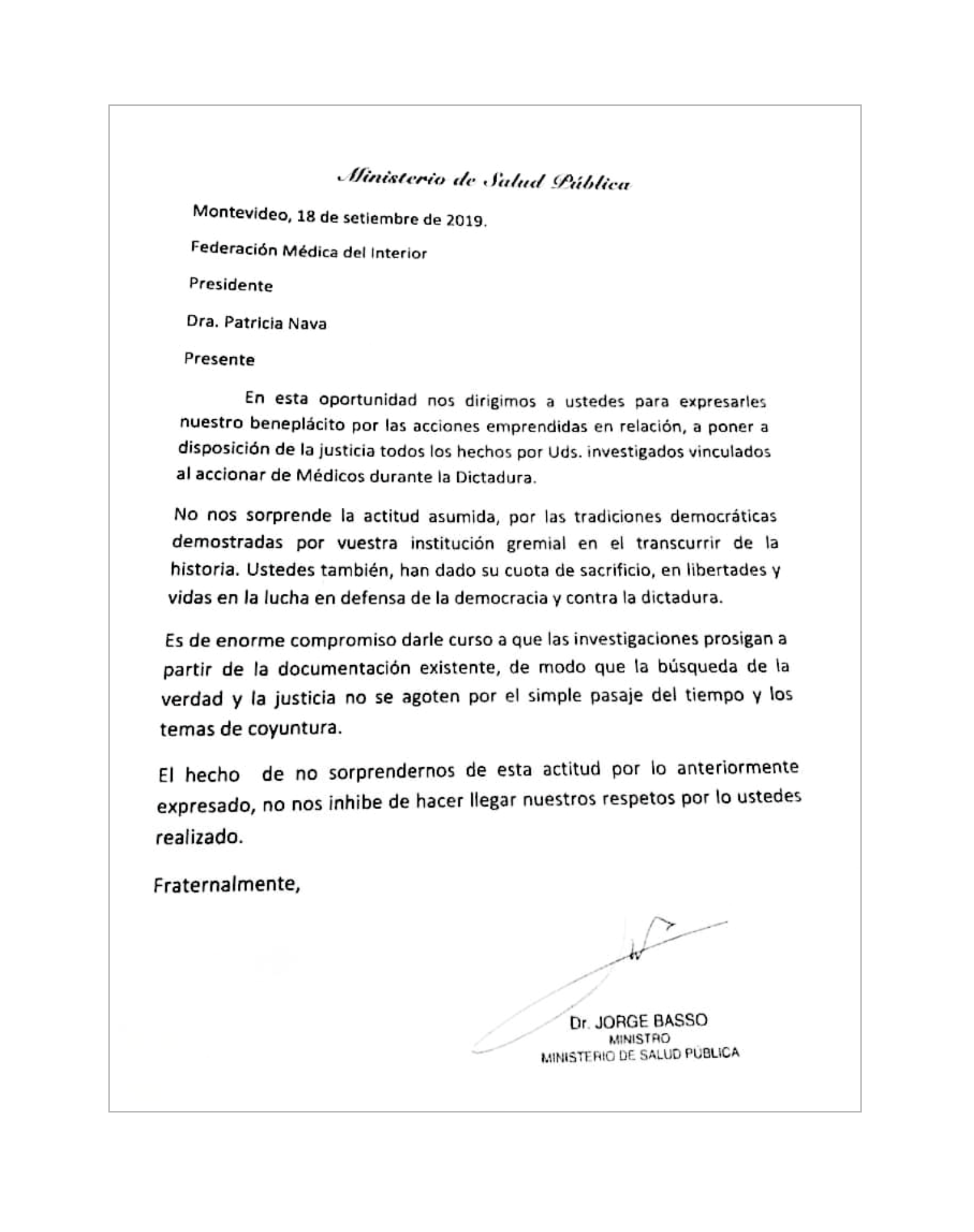 Compartimos la carta recibida de parte del Ministro Dr. Jorge Basso, en relación a la entrega de los archivos de los Tribunales de Ética Médica, refer [...]