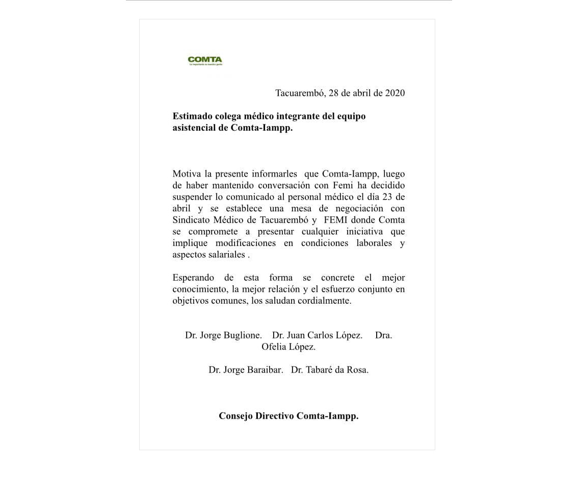 28/04/2020 - A través de tratativas realizadas por FEMI, se logra dejar sin efecto las medidas establecidas por COMTA IAMPP en nota enviada a personal [...]